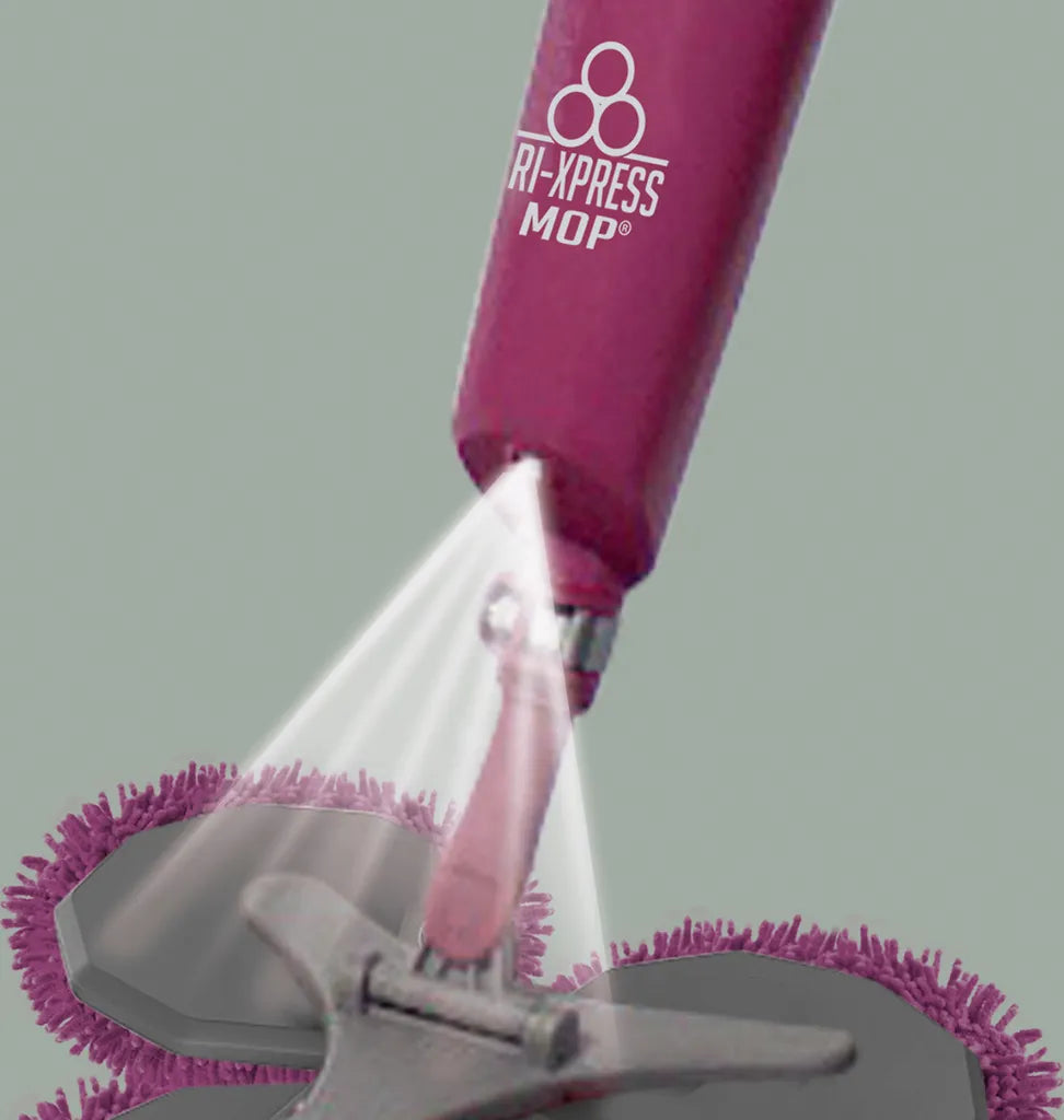 Simply Mop and Dry at the same time, the mop has a liquid refillable spray head, while the tri mop heads spin clean and drys the floor surface.