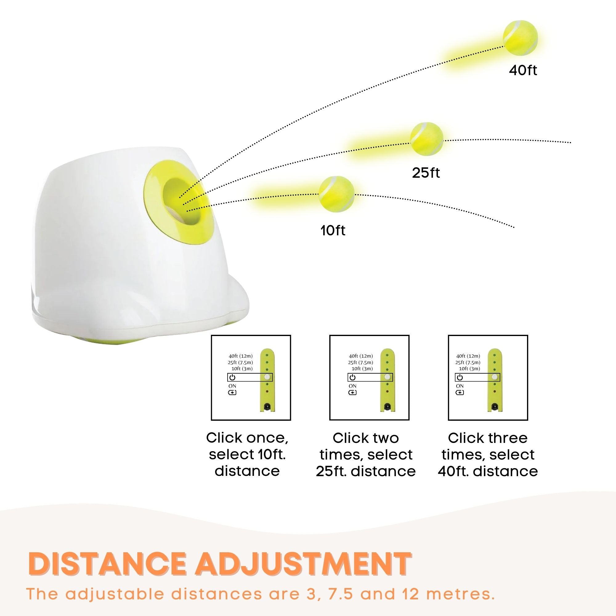• Adjustable Distance Settings - make it throw 10ft (3m), 25ft (7.5m) or 40ft (12m). Great training tool for both older dogs and as a way to tire out energetic puppies.