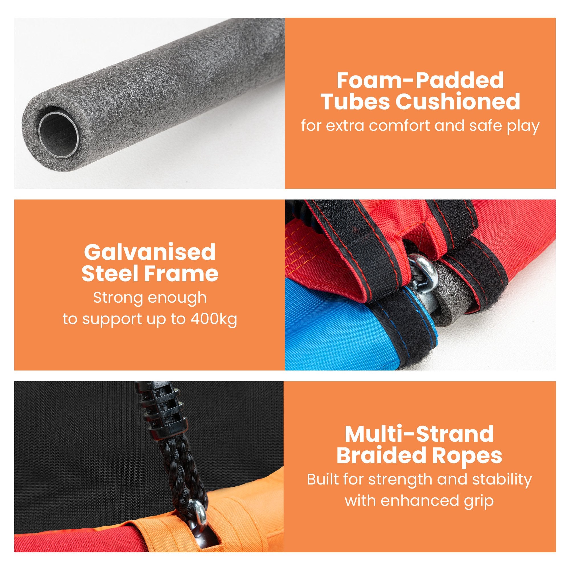 Get ready for endless swinging fun with Kahunas tree swing set! It features a sturdy galvanised pipe frame, comfy padded foam tubes and fun extras like colourful flags.